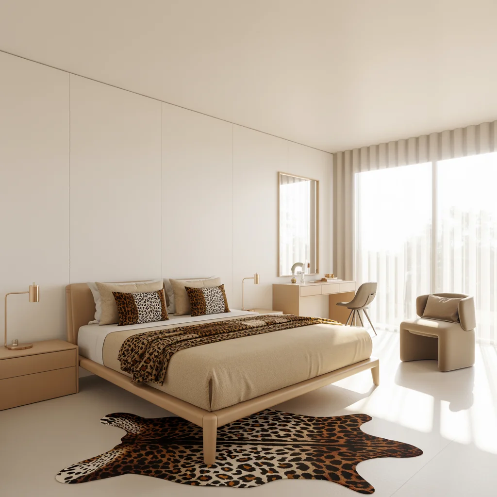This bedroom embraces a minimalist aesthetic with a touch of boldness from the leopard print accents. The light beige tones of the walls and furniture provide a calming backdrop for the vibrant pattern on the bedspread and rug.