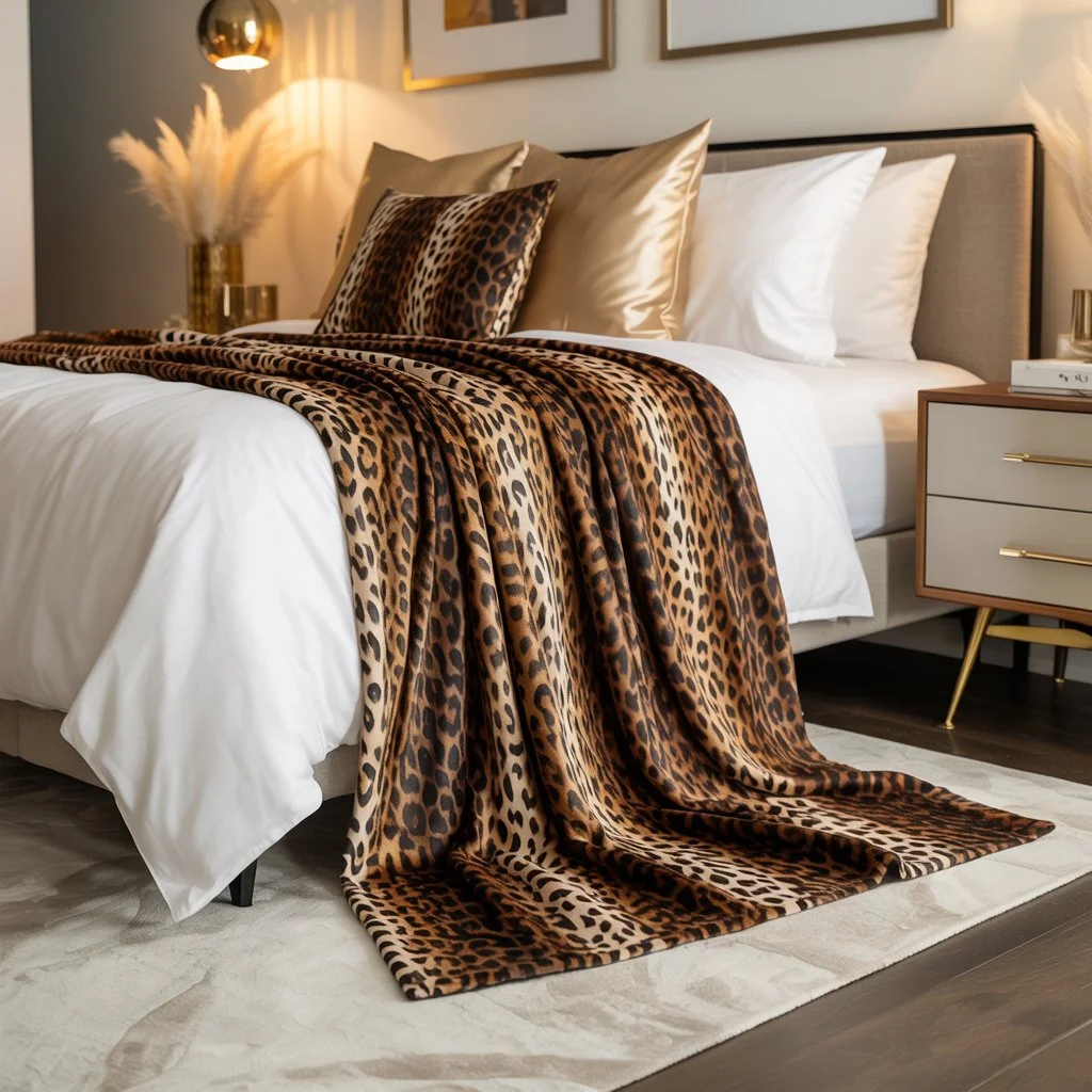 Soft golden pillows add a touch of luxury, perfectly complementing the rich tones of the blanket. The subtle decor and modern furniture provide a sleek backdrop, allowing the leopard print accents to truly shine.