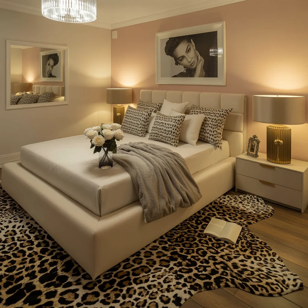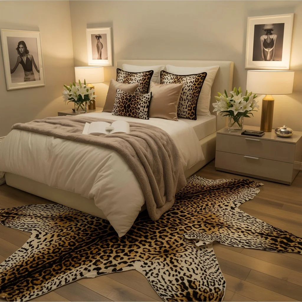 This chic bedroom blends luxurious leopard print with modern elegance. The animal-inspired rug covers the floor, drawing attention with its bold pattern while keeping the space grounded in neutral tones.