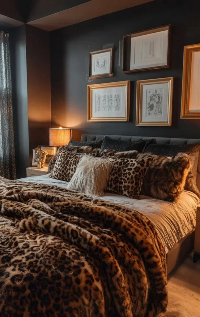 The soft, contrasting textures—leopard print throws, plush pillows, and smooth bedding—give the room an inviting yet lively vibe, making it a perfect choice for those seeking a space that feels both sophisticated and full of personality.