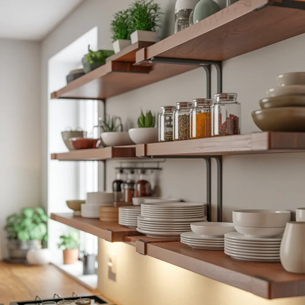 Warm wooden shelves paired with slim metal brackets bring a grounded and modern feel to this open shelving kitchen design. Natural light moves gently across the surfaces, helping the space feel open, calm, and thoughtfully arranged.