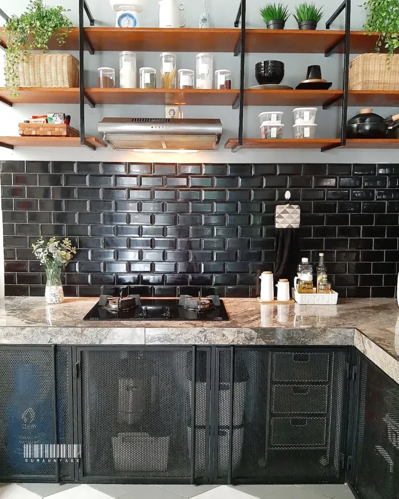 Bold black tile sets a strong foundation, giving this open shelving kitchen a confident and structured presence. Warm wooden shelves soften the darker tones, creating balance while keeping the space visually grounded and inviting.