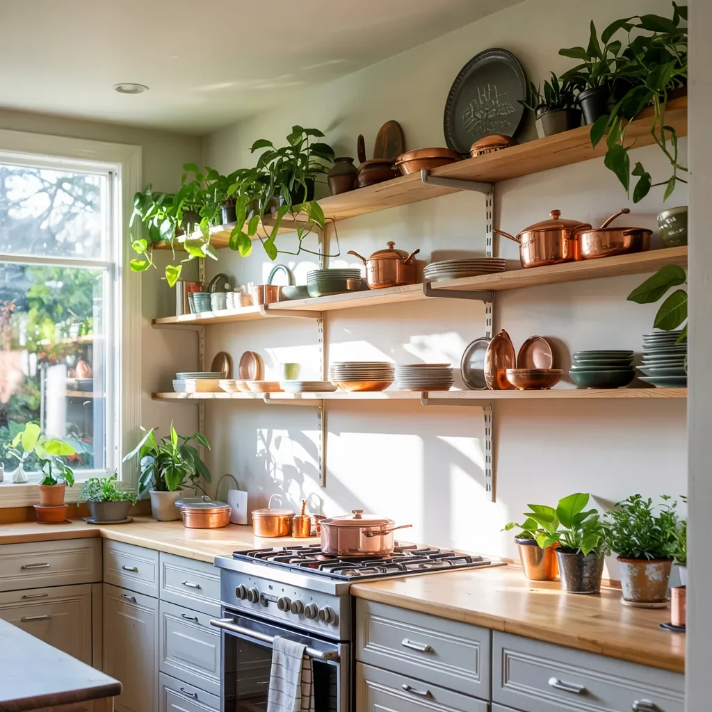 Lush green plants trail across the shelves, bringing energy and life into the kitchen without feeling overpowering. Copper cookware and everyday dishes sit comfortably together, blending function with visual warmth.