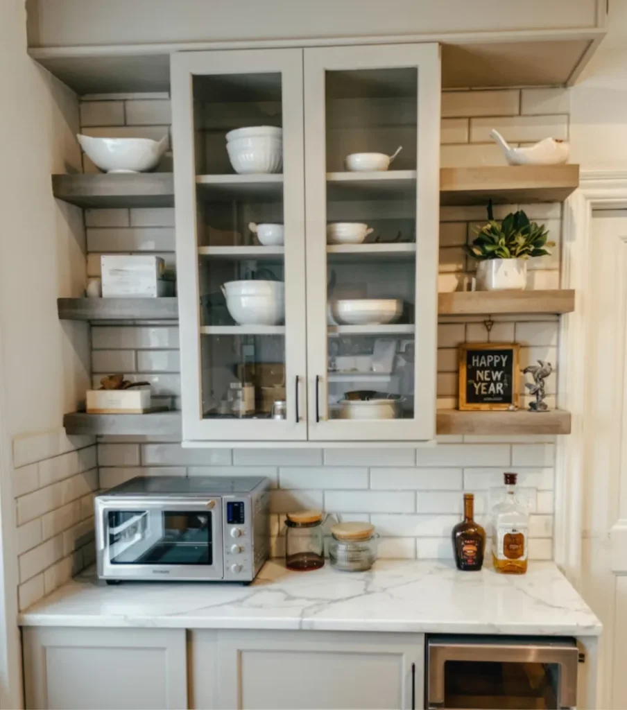 Glass front cabinets add depth while allowing everyday dishware to remain visible and easy to reach. Open shelves on the sides introduce contrast, making room for decorative pieces and practical storage to coexist.