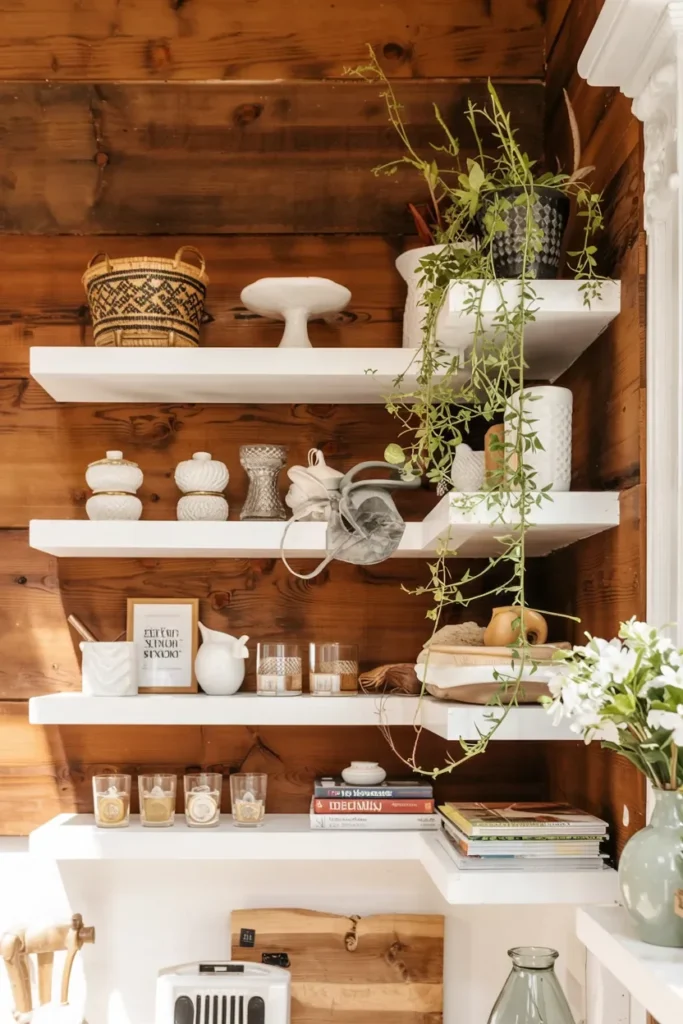 Warm wooden walls create a cozy backdrop, allowing crisp white shelves to stand out with quiet confidence and charm. Natural light softens the textures, giving the kitchen a relaxed mood that feels welcoming from every angle.