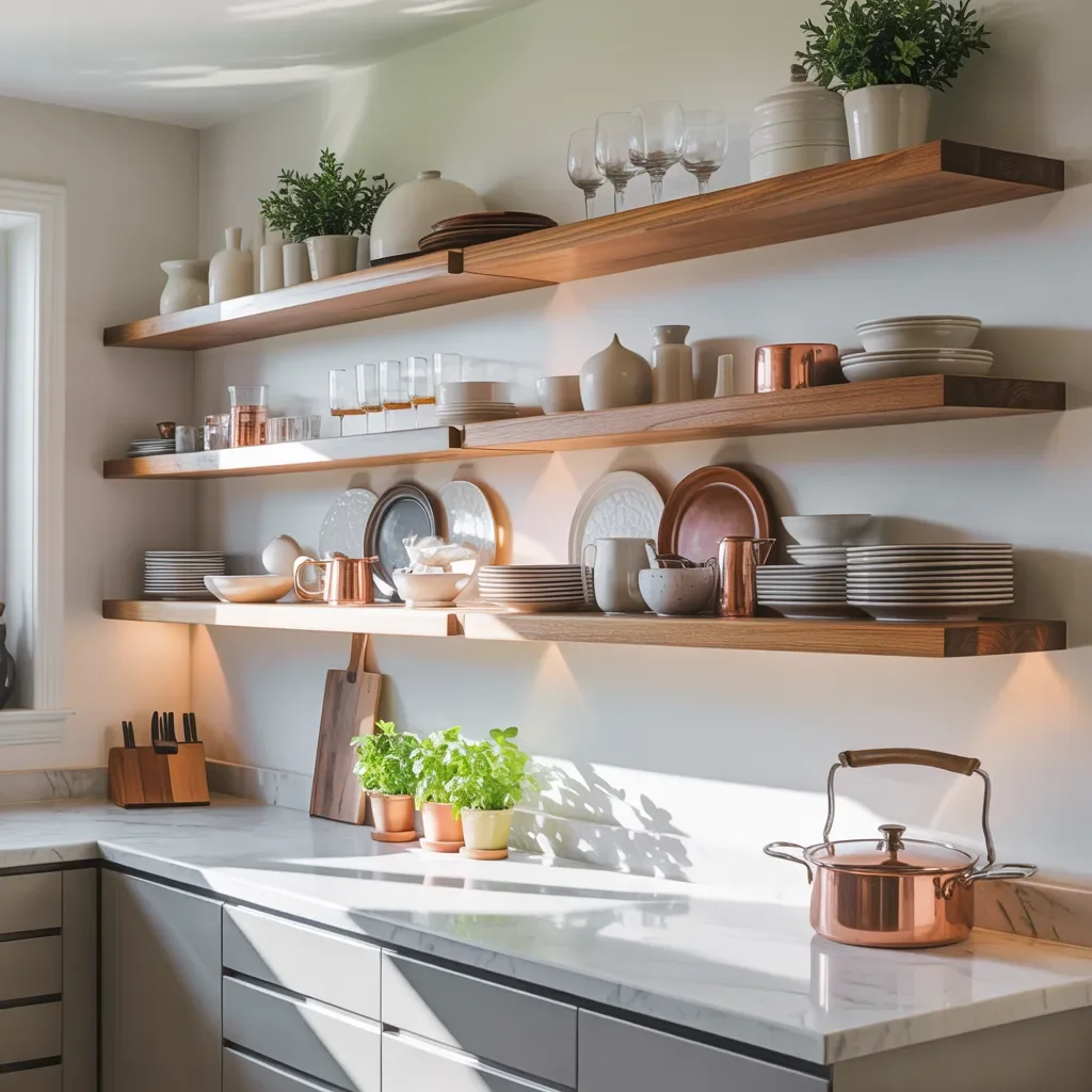 Soft natural light fills this open shelving kitchen, highlighting warm wooden shelves that bring balance and openness to the space. Clean lines and neutral tones create a calm setting where function and style work together without feeling heavy.
