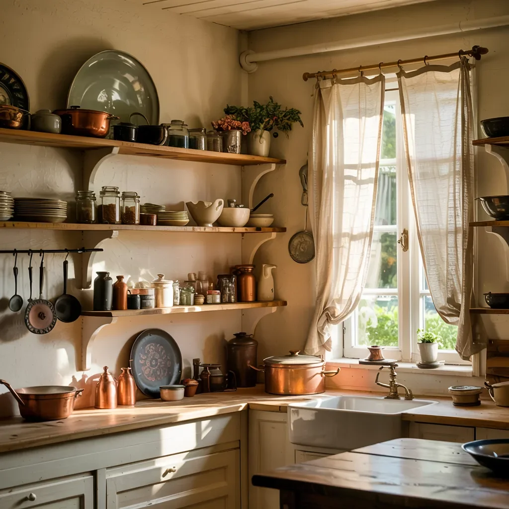 Morning light filters through soft curtains, washing the open shelves in a warm glow that feels calm and welcoming. Natural wood surfaces and creamy walls create a gentle backdrop where everyday kitchen life feels slow and intentional.