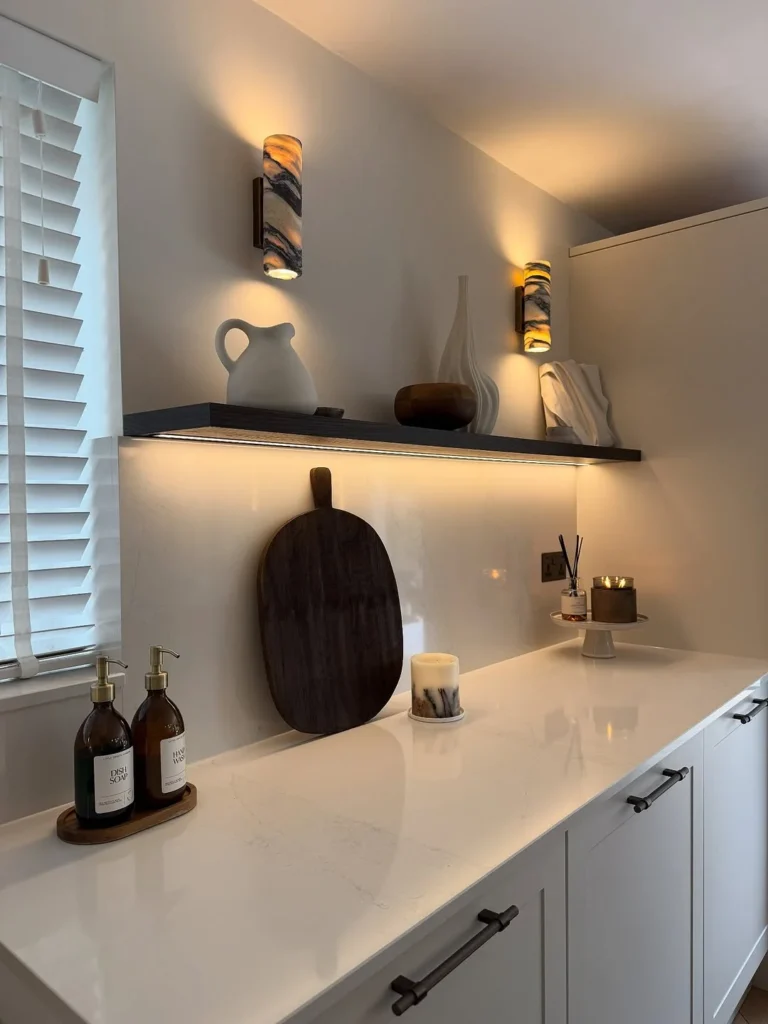 Warm wall lighting creates a soft atmosphere, allowing this open shelving kitchen to feel calm and thoughtfully composed. Clean white surfaces reflect the glow, giving the space a gentle balance between light, shadow, and everyday comfort.