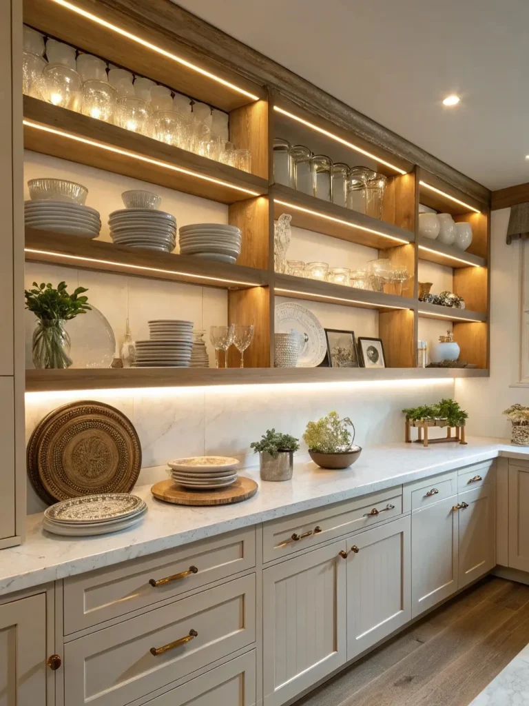 This setup shows how open shelving kitchen ideas can feel refined through restraint and careful lighting. Soft illumination and minimal styling work together to create a space that feels peaceful, functional, and welcoming.