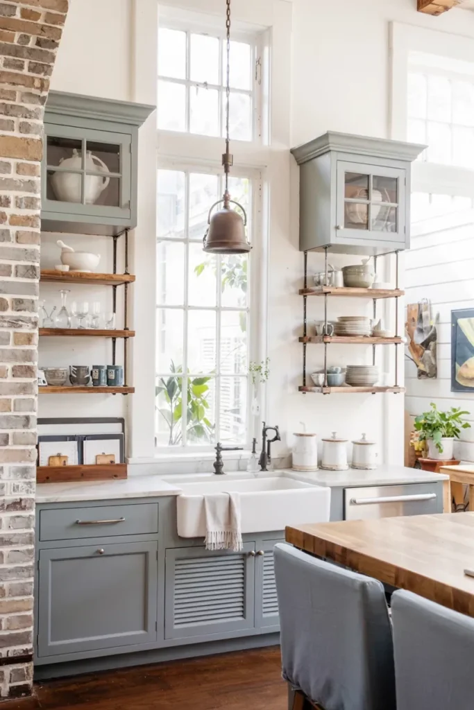 Natural light pours through tall windows, giving this open shelving kitchen a bright and airy presence. Muted cabinetry and warm wood accents work together to create a space that feels calm and comfortable.