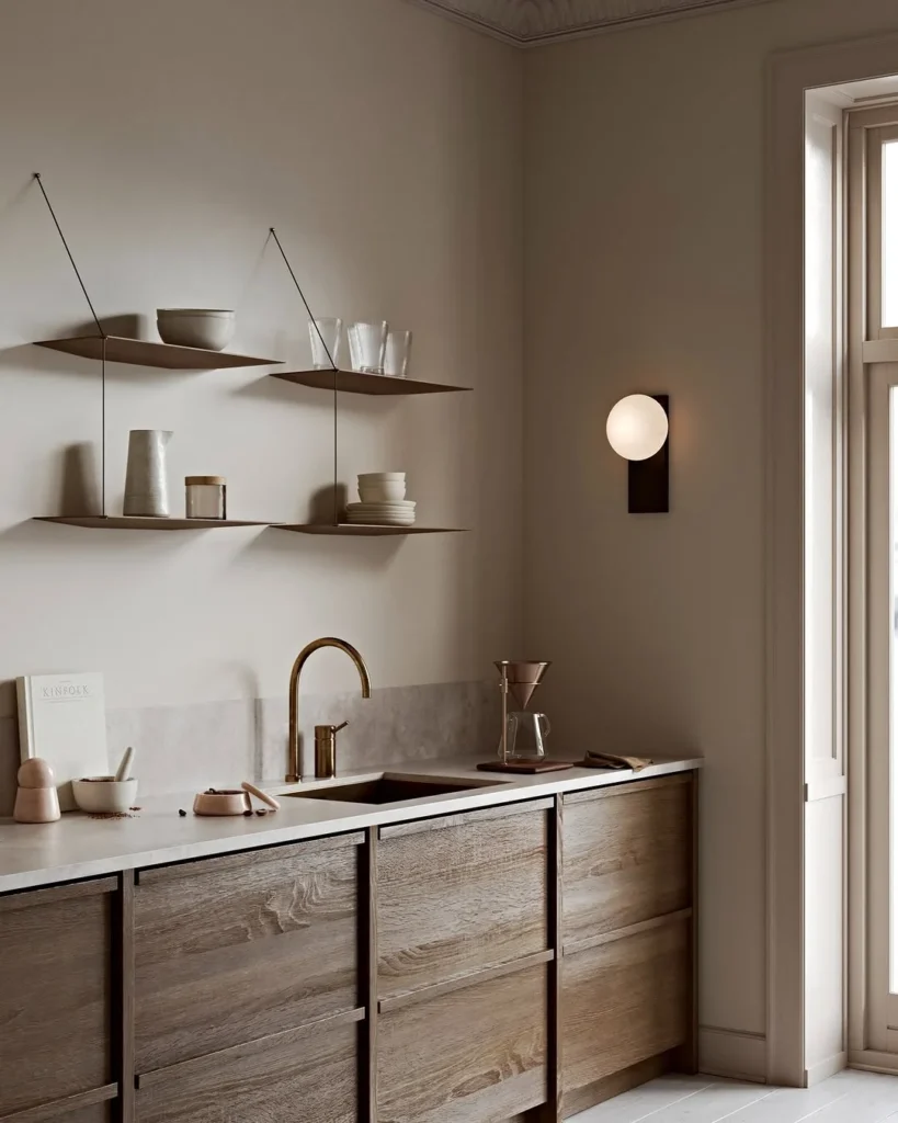 Soft neutral walls paired with slim wooden shelves create a calm and uncluttered open shelving kitchen look. The suspended design feels light, allowing everyday pieces to appear almost weightless against the wall.