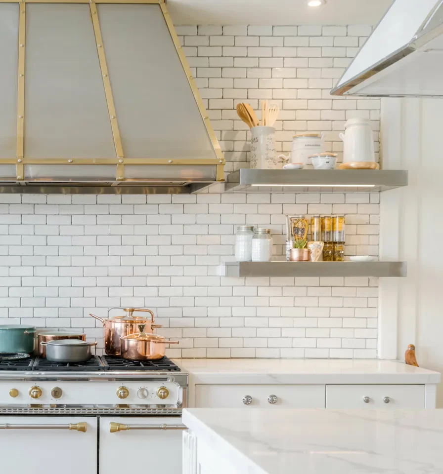 Clean metal shelves paired with a white tile wall bring a fresh and structured feel to this open shelving kitchen idea. Soft brass details on the range hood add warmth, keeping the space from feeling too sharp or industrial.