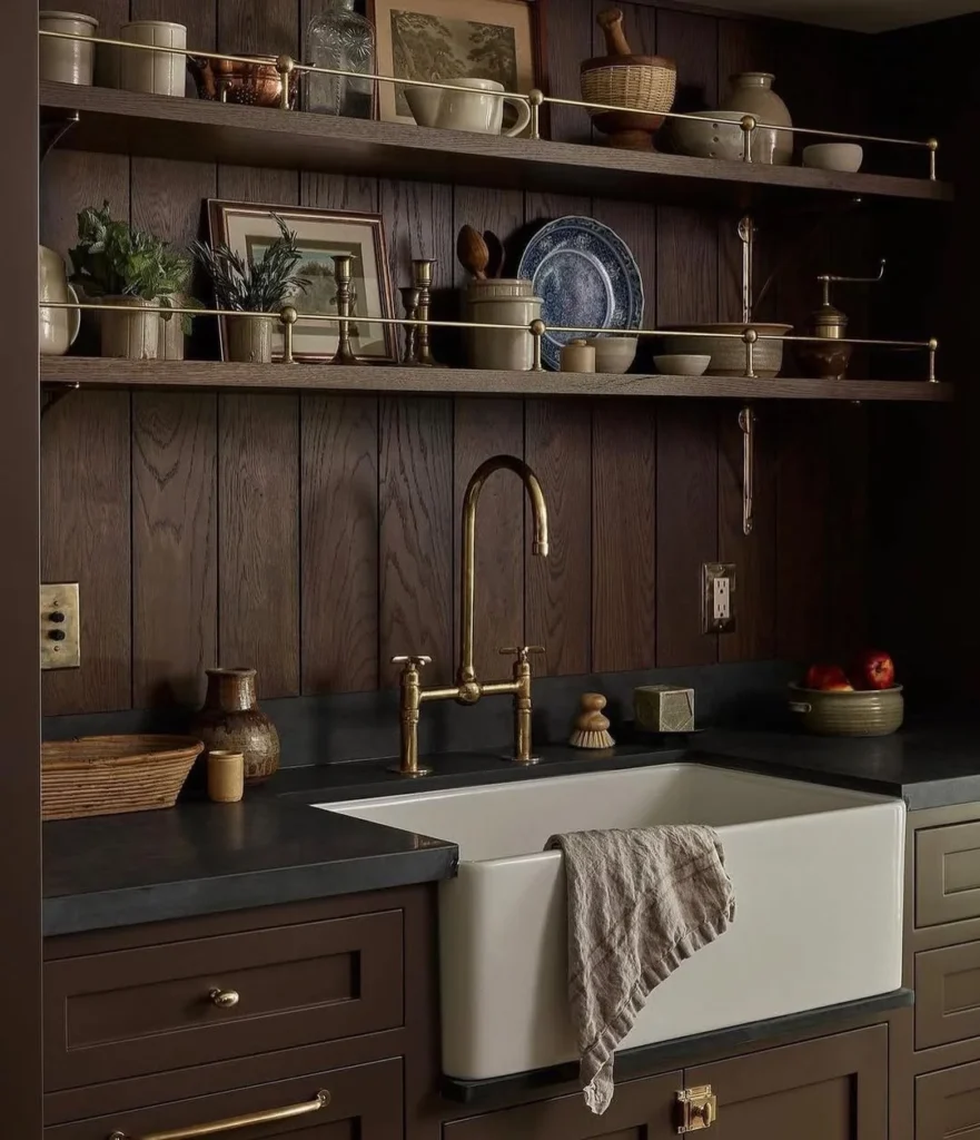 A farmhouse sink anchors the space and adds contrast against darker finishes and shelving above. Natural materials work together to create depth, making the kitchen feel calm and established.