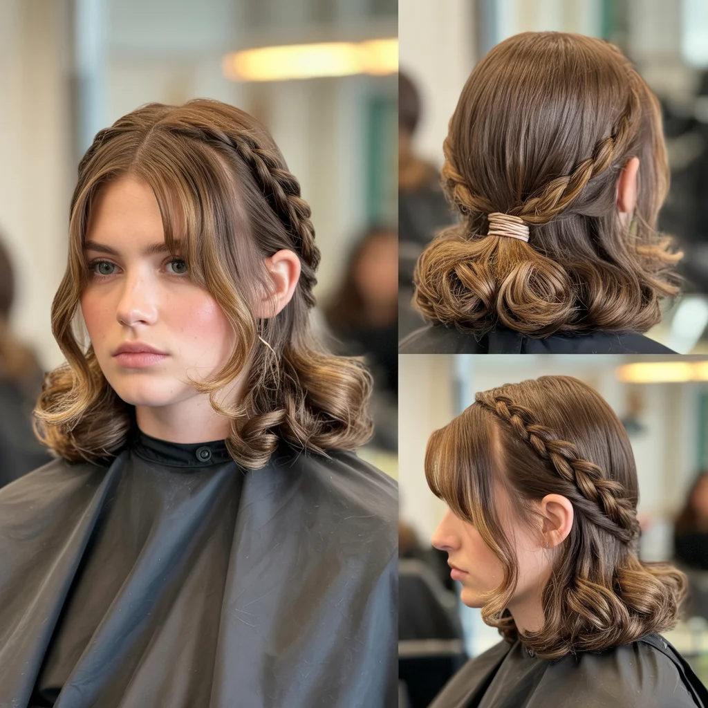 Curtain bangs soften the braided detail, making the hairstyle youthful and balanced. It’s a great option for modern prom looks.