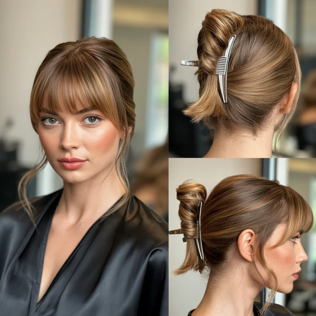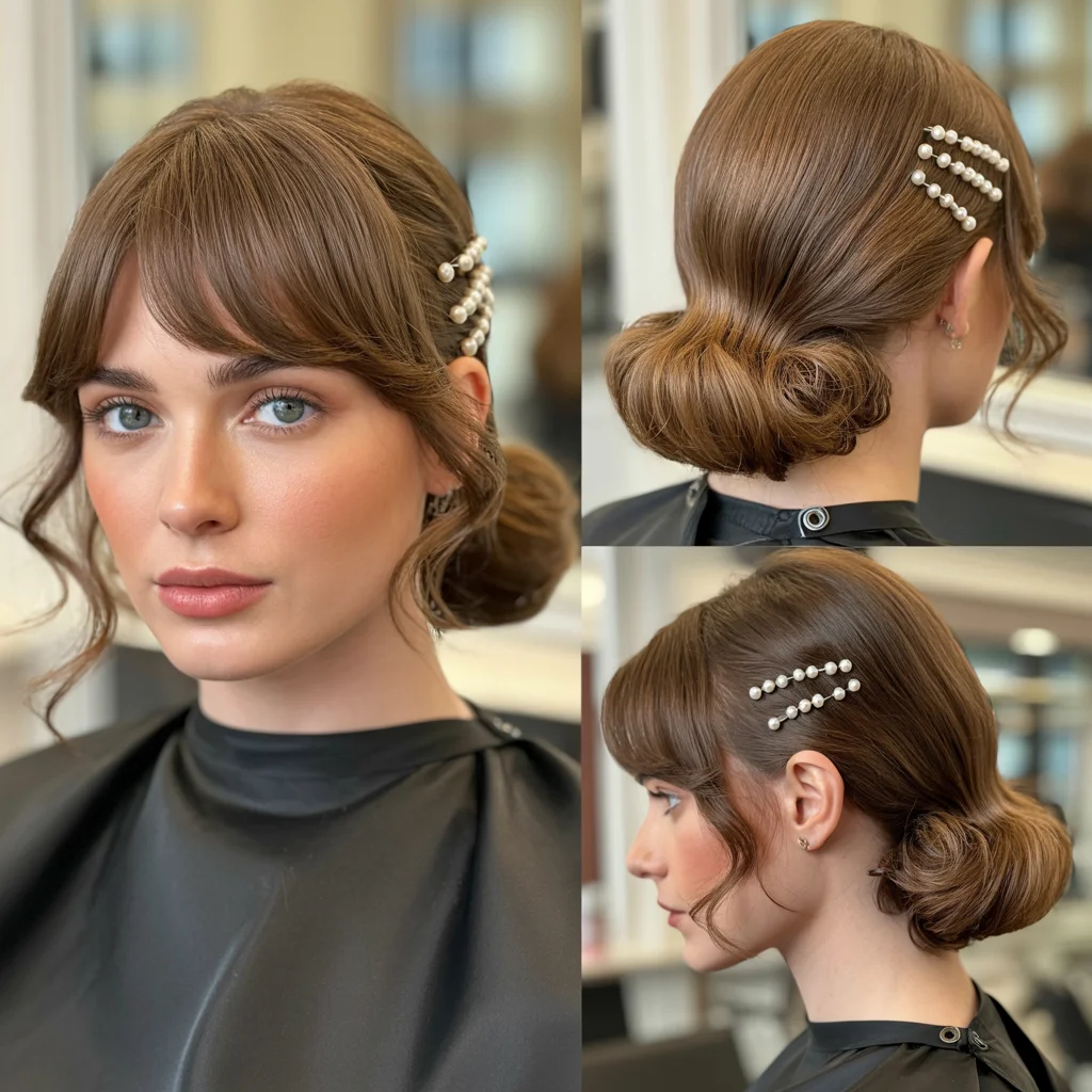 Curtain bangs keep the hairstyle soft and youthful. The accessories add sparkle without overpowering the overall look.