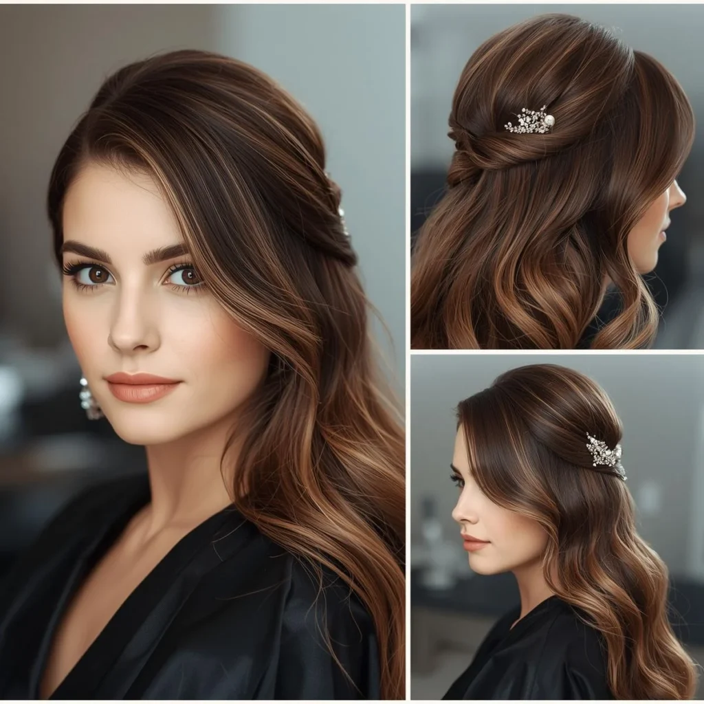 Accessories elevate any prom hairstyle. This look features a simple half up half down style enhanced with pearls or crystals.