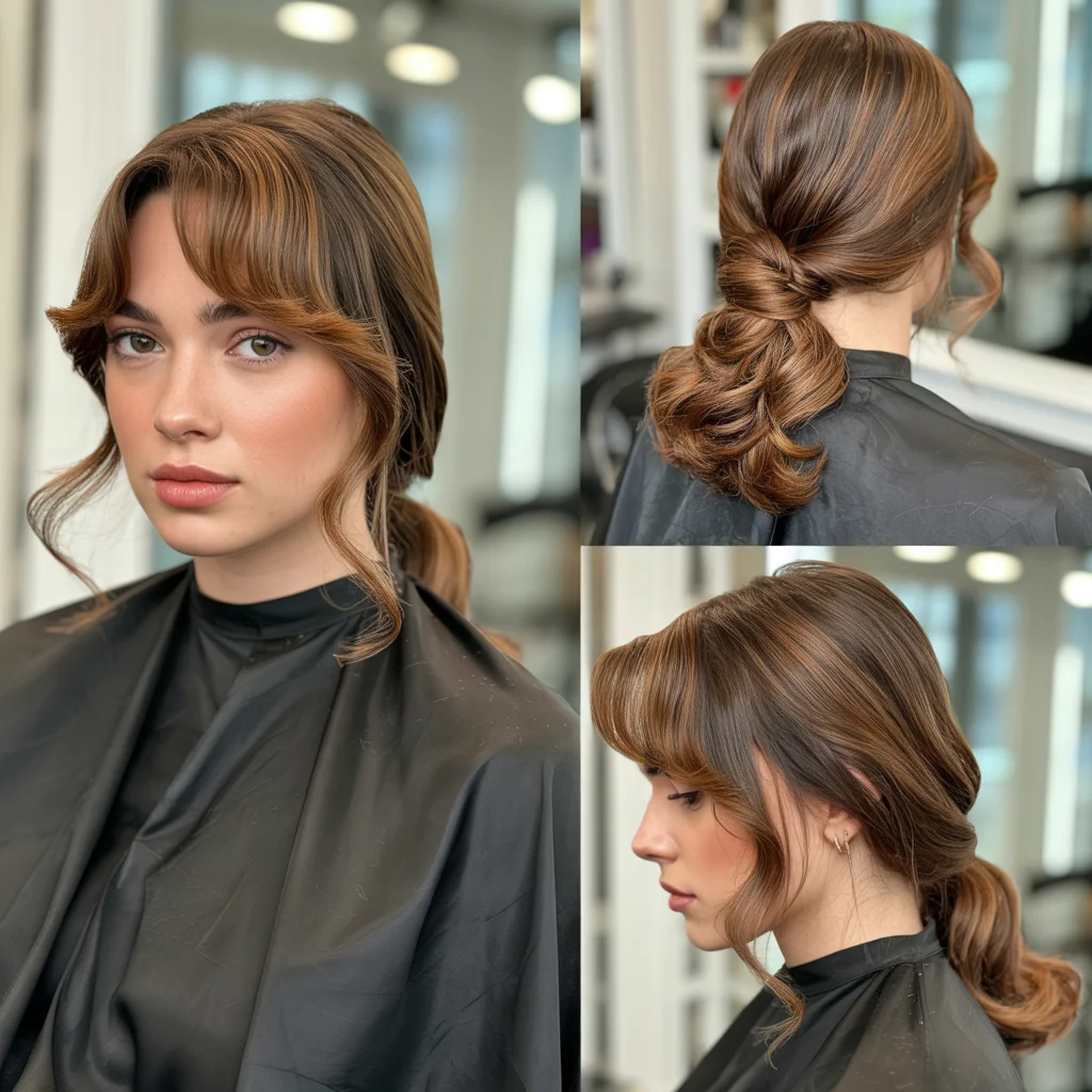 Curtain bangs enhance the romantic feel, gently framing the face. This look is perfect for prom themes that lean classic, dreamy, or fairytale-inspired.