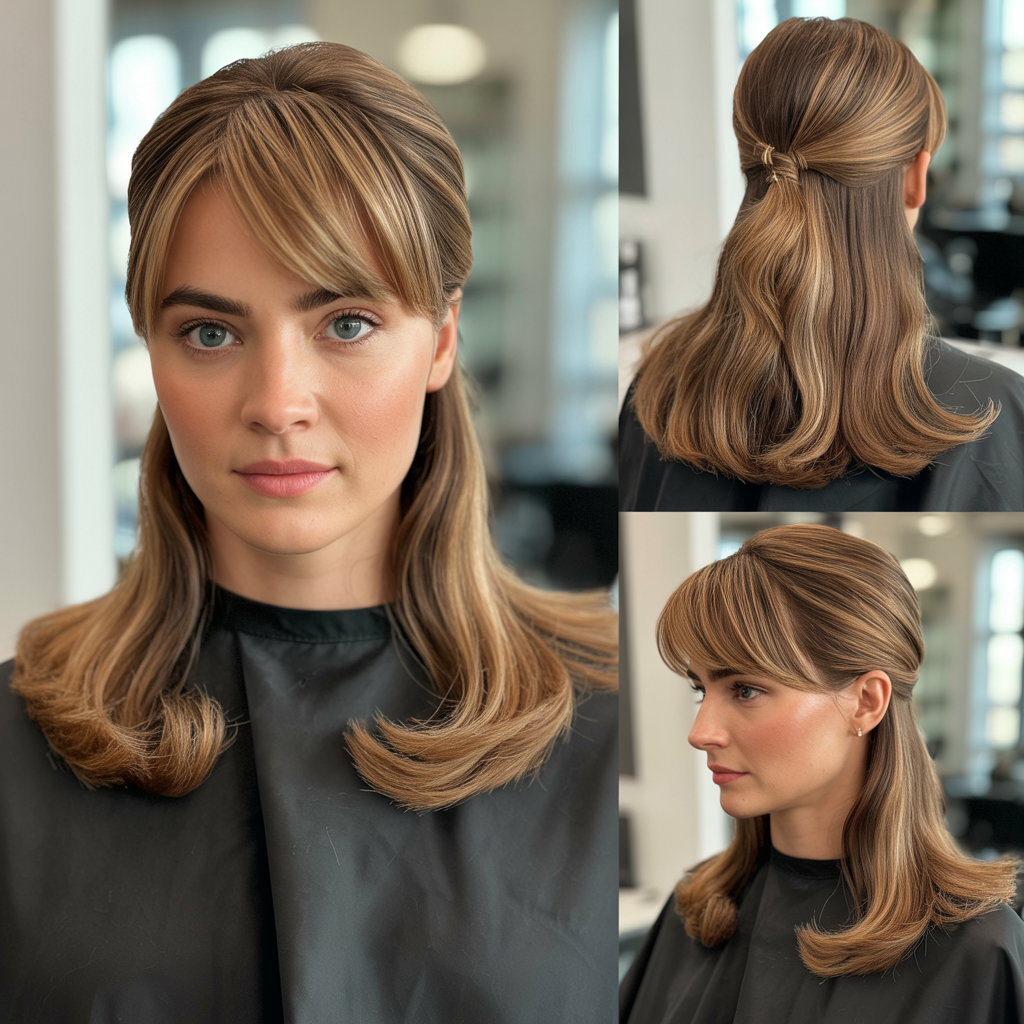 14. Half Up Half Down with Curtain Bangs and Volume