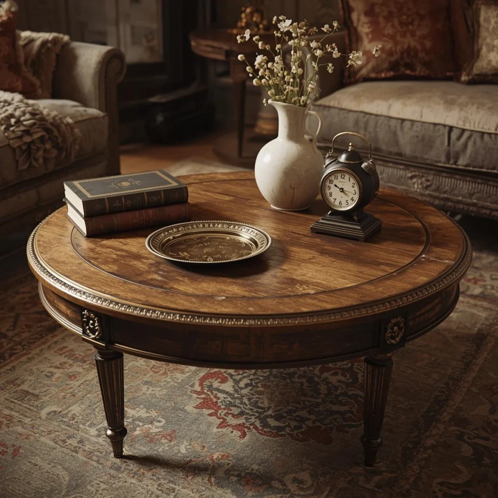 A vintage round coffee table can be a stunning addition to a traditional or retro-inspired space. These tables often feature ornate carvings, antique brass accents, and weathered wood, evoking the charm of bygone eras. Vintage round tables are ideal for those who love antique decor and want to bring an element of nostalgia to their home.