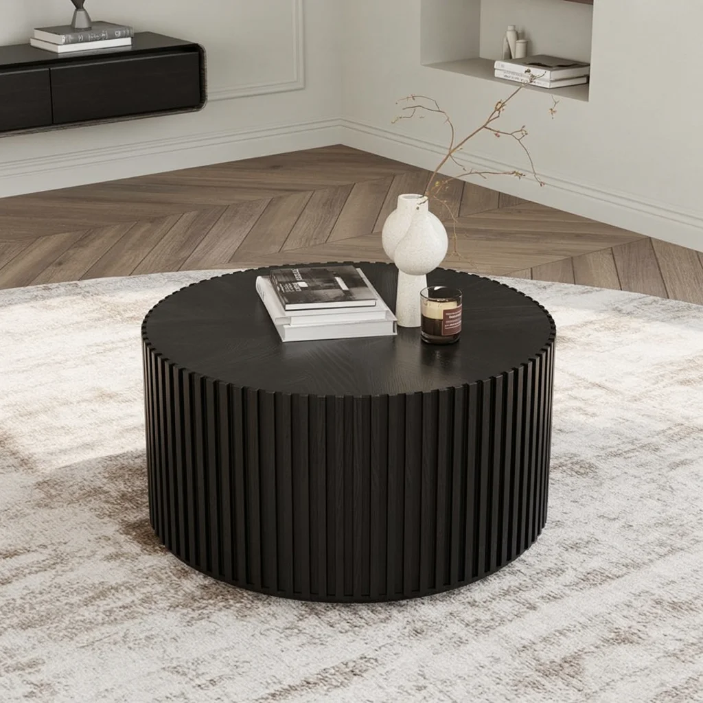 This modern round ribbed coffee table offers a striking design with its sleek dark wood finish and textured ribbed sides, adding depth and sophistication to any modern living room. The clean lines and minimalist aesthetic make it a versatile piece that complements various interior styles, from contemporary to industrial. Its round shape and sturdy structure create a sense of balance and harmony in your space, while the textured surface provides visual interest.