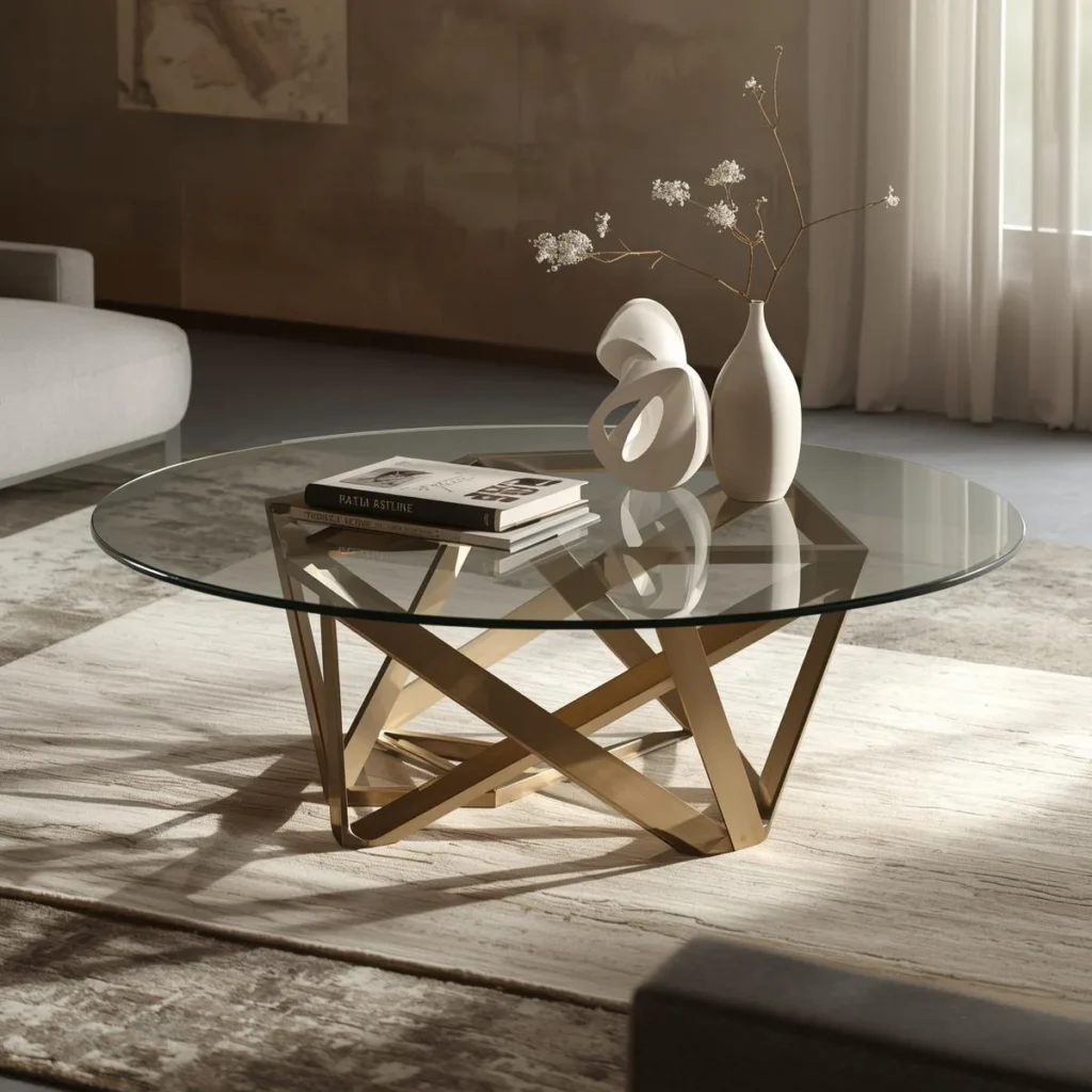 A circular coffee table with a geometric base is a bold, statement-making piece that adds an artistic flair to any modern living room. Featuring a glass top and a metal base with geometric shapes like triangles, circles, or zigzags, this table combines modern art with functionality.