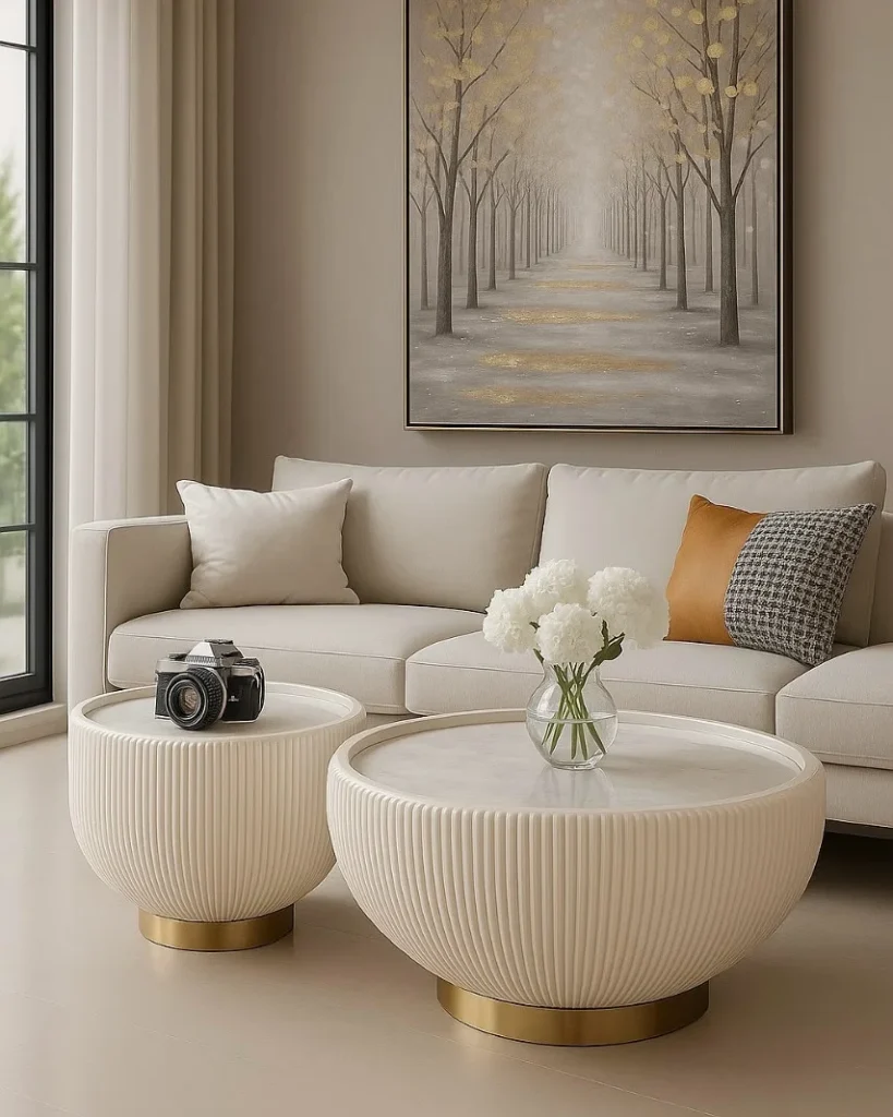 This sculpted round coffee table set brings a refined and artistic presence to the living space. The ribbed texture adds depth and visual interest, while the soft ivory tone keeps the look calm and sophisticated. Finished with a subtle gold base, these tables strike the perfect balance between modern design and timeless elegance.