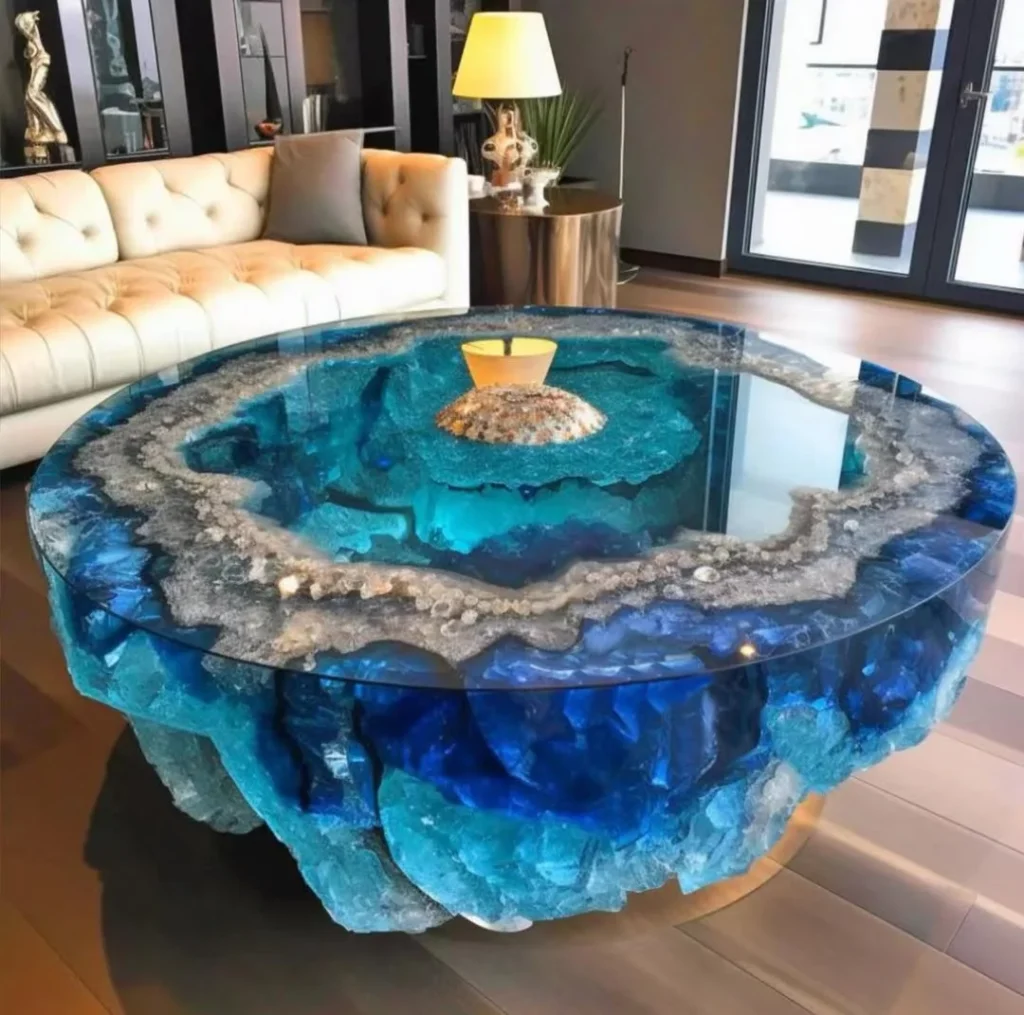 This round statement coffee table is a true work of art, designed to become the focal point of any space. Inspired by natural crystal formations, the deep blue and turquoise resin layers create a mesmerizing, ocean-like effect. The transparent surface reveals rich textures beneath, giving the table depth, drama, and a one-of-a-kind presence.
