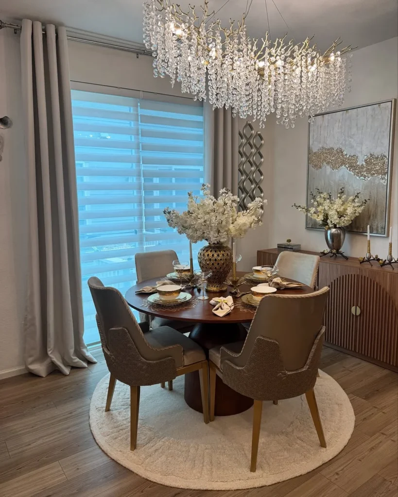 A round dining table gains a modern, warm character in this styled corner, showing how simple choices can elevate a room. Soft beige chairs wrap around the wooden table, giving the space a calm and inviting feel. Crystal lighting above casts a gentle shimmer, bringing attention to the gold-accented centerpiece and tableware. Each element works together to create a scene that feels both stylish and comfortable.