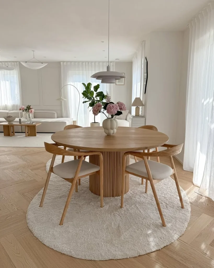 A calm and airy look fills this modern round dining setup, showing how soft neutrals can shape a peaceful space. Light wood tones on the table and chairs bring warmth without weighing down the room. A ribbed pedestal base adds quiet texture, giving the table a sculptural feel that stands out gently. The plush circular rug beneath anchors the setting and adds a cozy touch underfoot.