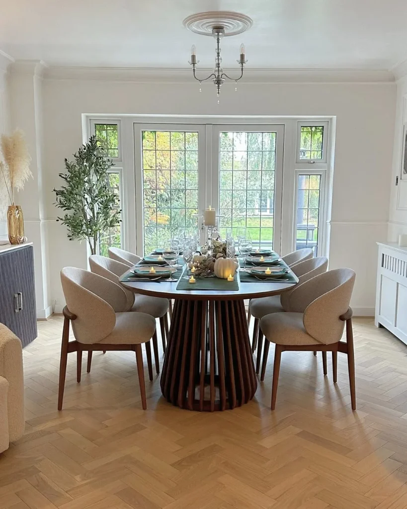 A round dining table gets a fresh, modern look in this airy room, showing how clean lines and soft tones can shape a beautiful gathering spot. Natural light pours through the large windows, giving the setup a warm and welcoming atmosphere. Curved upholstered chairs surround the table, adding comfort while keeping the style contemporary. A sculptural wood base adds character, making the table the standout piece in the room.