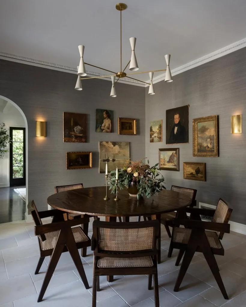 A lush floral arrangement sits at the center, paired with tall brass candlesticks that bring a touch of romance. The gallery wall behind the table adds personality, telling its own story through classic frames and art pieces. Gentle wall sconces cast a warm glow that ties everything together. This decor idea highlights how rich tones, layered textures, and curated vintage accents can elevate a round dining table in a modern yet timeless way.