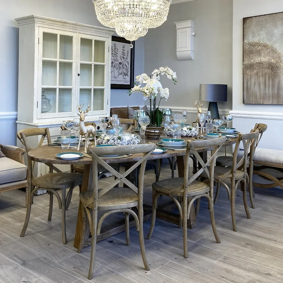 A cozy and charming scene shapes this dining room, showing how rustic elements can blend with modern decor beautifully. The round wooden table brings warmth to the space, while the cross-back chairs add a familiar, inviting touch. Soft lighting from the crystal chandelier above casts a gentle glow, giving the room an elegant uplift. Each place setting features cool-toned plates and clear glassware, creating a fresh contrast against the warm wood.