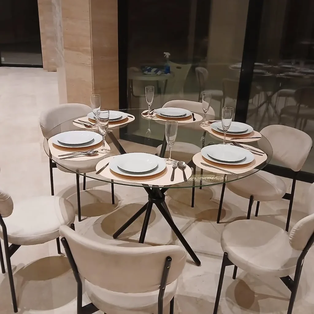 A clean and contemporary look defines this modern round dining setup, showing how glass can keep a space feeling open and airy. The transparent tabletop brings a light, floating effect that works beautifully in rooms with neutral tones. Soft beige chairs surround the table, adding comfort while keeping the style simple and cohesive. Their slim black legs offer a subtle contrast that ties the whole scene together.