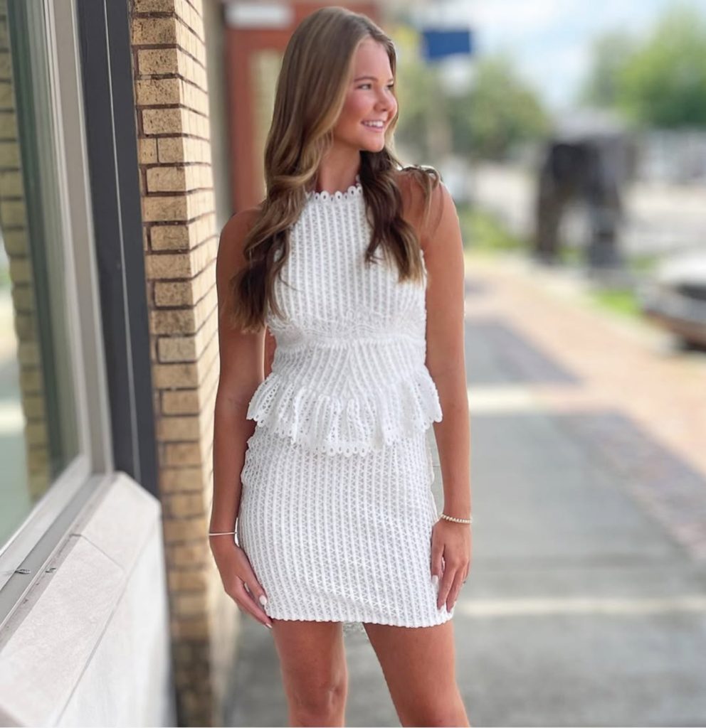 This outfit is an effortlessly chic and feminine choice, perfect for quick outings or casual gatherings. The soft pink halter top exudes a light and airy feel, with delicate ruching that highlights the waistline and adds a touch of texture. Paired with a flirty white skirt featuring scalloped edges and intricate eyelet detailing, the look becomes playful yet sophisticated.