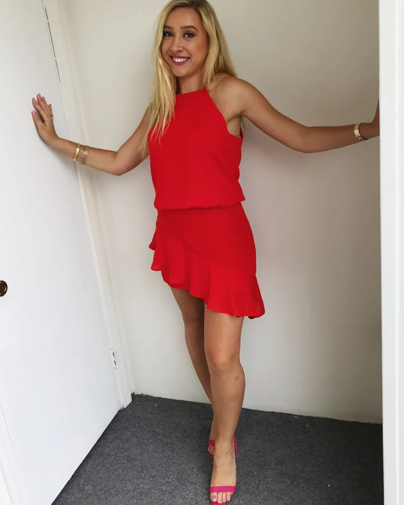This bold red dress is a quick fix for when you’re in a rush but still want to make a statement. The halter neckline paired with the ruffled hem creates a balanced look, combining sophistication and a touch of fun. The simple silhouette allows for comfort while the flirty frills add a playful element. The dress fits snugly on the top and gradually flows out, offering both ease of movement and style.