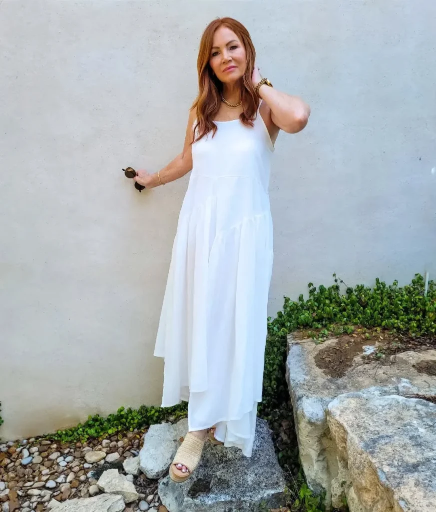 The high-low hemline adds a modern touch, giving the outfit a bit of playful charm. The simplicity of the dress allows for easy styling, making it a go-to option when you’re in a rush but still want to look chic. Paired with neutral sandals and minimal jewelry, this outfit is both versatile and fresh.