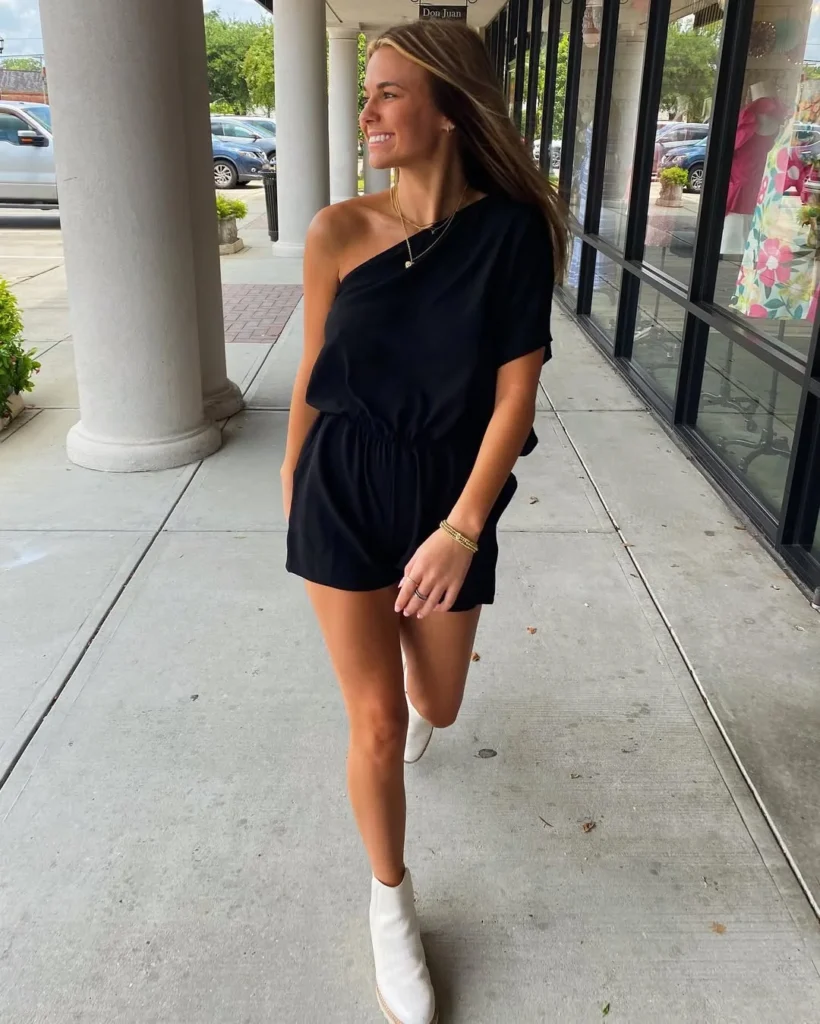 Its simplicity is what makes it versatile, effortlessly going from casual daytime wear to a laid-back evening look. The black color enhances the sleek and sophisticated vibe, while the one-shoulder design adds a touch of chic to an otherwise simple outfit.