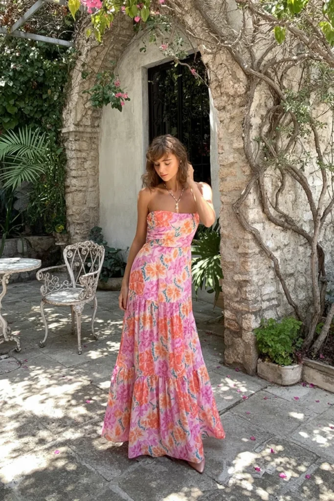 This stunning strapless floral dress exudes effortless elegance and is perfect for a sunny day or casual evening out. The bold, bright florals in shades of pink and orange contrast beautifully with the soft, airy fabric, making it a go-to choice for warm-weather occasions. The tiered design adds dimension and movement, while the flowy hemline ensures comfort and style.