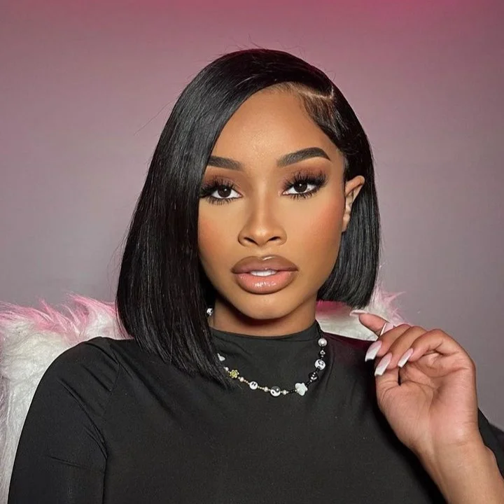 This sleek bob cut provides a clean and modern look, making it a perfect choice for black women seeking a minimalist yet elegant hairstyle. The sharp, straight lines of the bob fall just below the chin, creating a balanced silhouette. The center part adds symmetry, complementing the straightness of the hair for a polished finish.