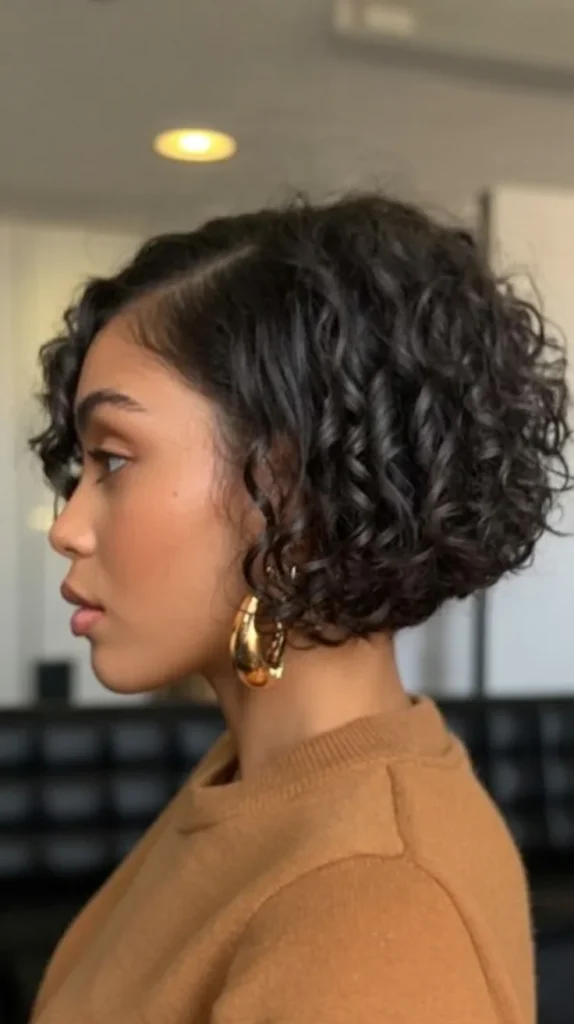 The bob’s length is just right to provide both movement and structure, making it suitable for various occasions, from casual gatherings to formal events. This hairstyle embraces natural curls while offering a polished, defined look, perfect for black women who love a balance of texture and sleekness.