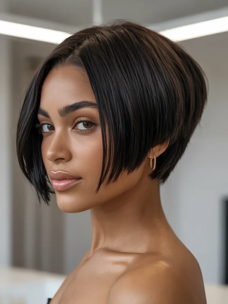 This sleek backward bob creates a stunning visual effect with its sharp, graduated layers. The back is neatly tucked under, allowing the hair to subtly curve toward the nape, giving it volume and movement. The glossy texture adds a sophisticated edge, making this look the perfect balance of chic and polished.