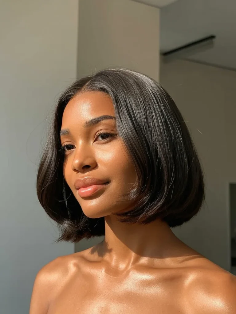 With minimal effort, this look exudes confidence and style, making it suitable for both professional and casual settings. The shine on the hair enhances the overall smoothness, while the length and structure of the cut give it an effortlessly chic appearance. This bob is ideal for anyone seeking a simple yet impactful hairstyle that never goes out of style.