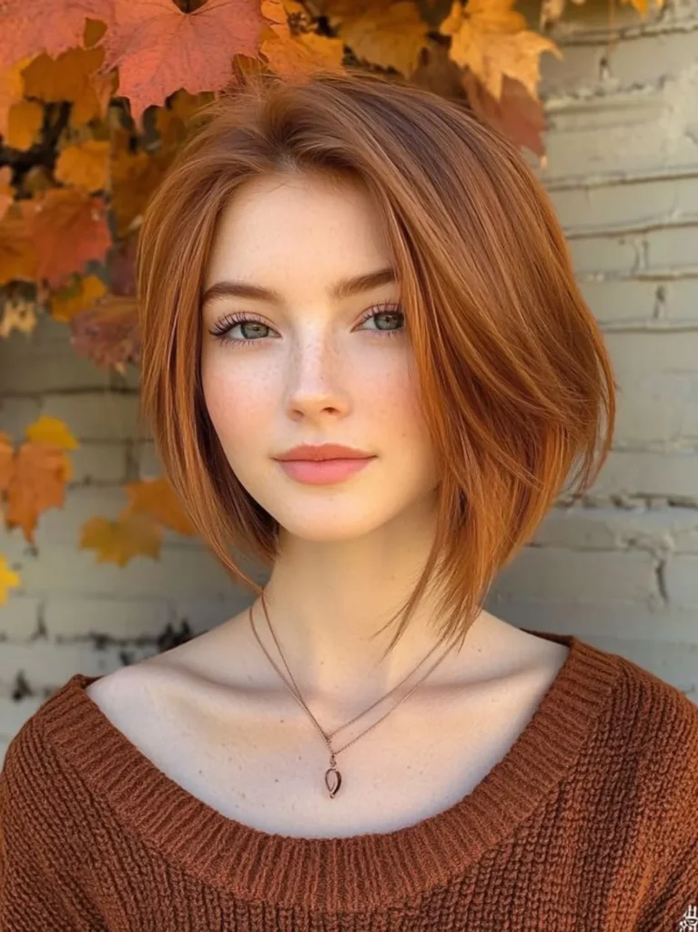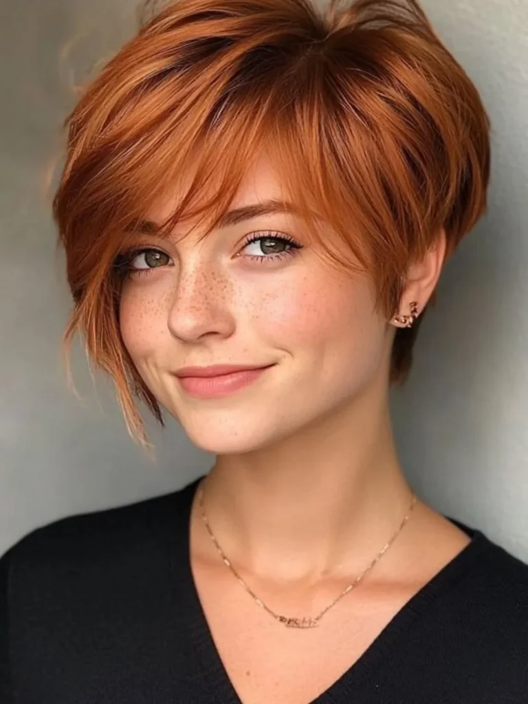 A warm copper bixie brings a bold new look with soft shine and face framing movement. The length grazes the collarbone while the back stays lightly tapered, giving that short funky pixie energy with extra flow.