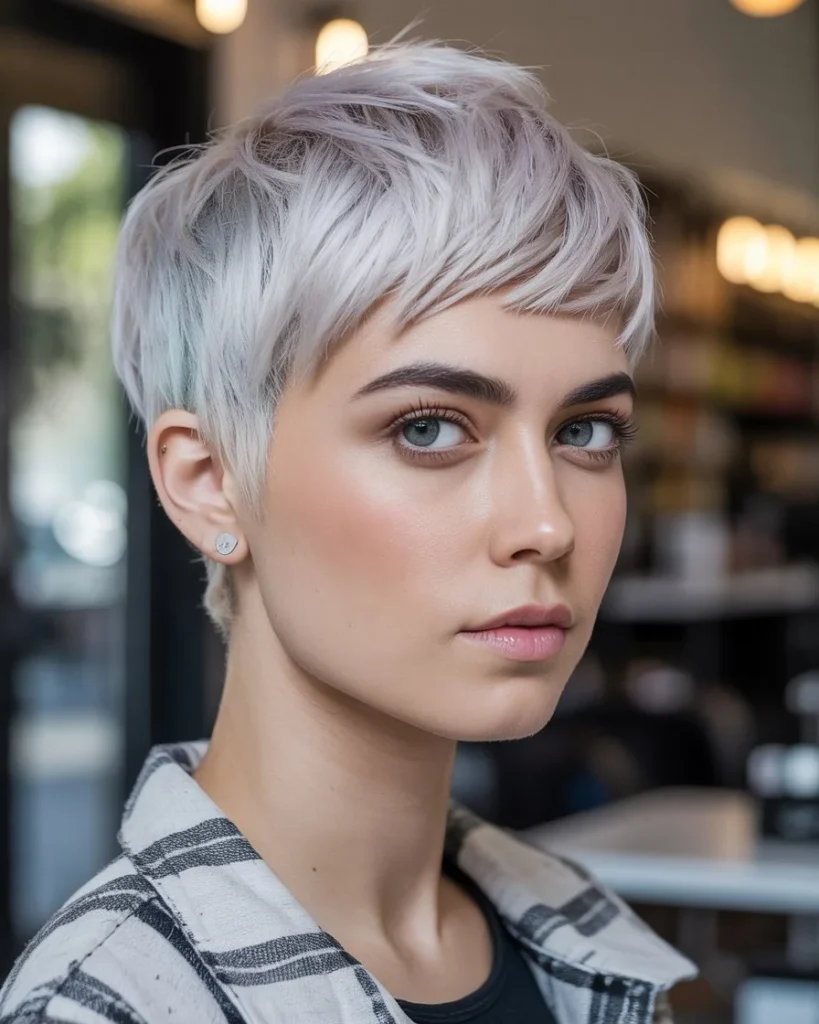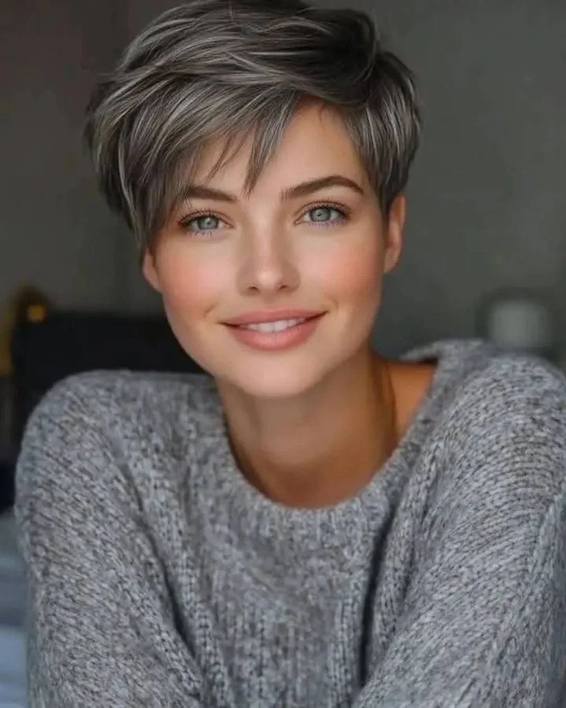 Salt and pepper tones give this pixie a cool glow that brightens the eyes. Choppy layers build lift at the crown while the sides stay neat for a clean outline.