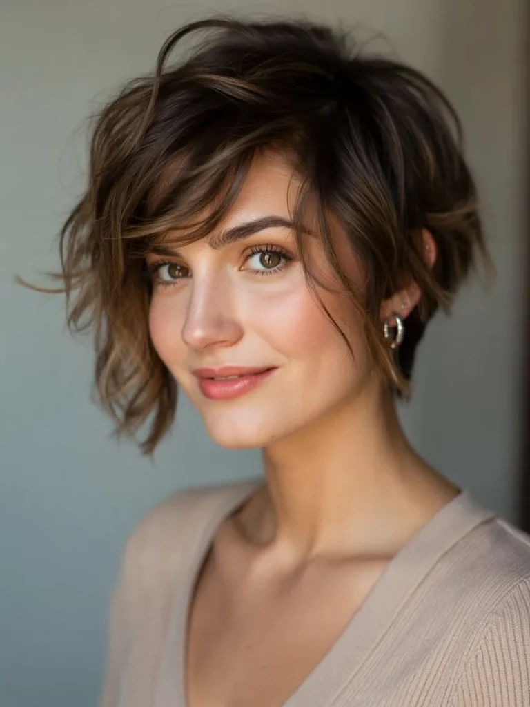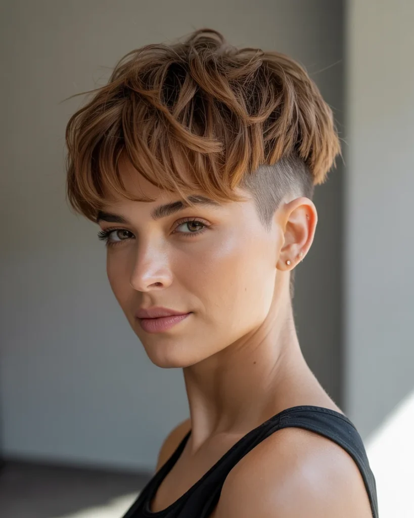 If you crave a high fashion vibe, a micro fringe pixie is a powerful choice. The fringe sits just above the brows, which opens the face and pairs beautifully with strong eyebrows or a statement eyeliner.