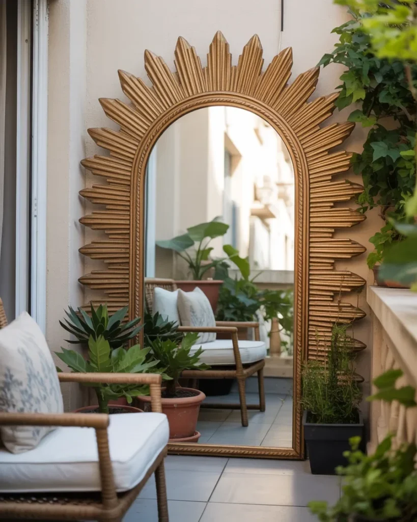 A statement mirror like this one instantly elevates any small balcony. Its sunburst design adds a bold, artistic touch, drawing attention and making the space feel larger.