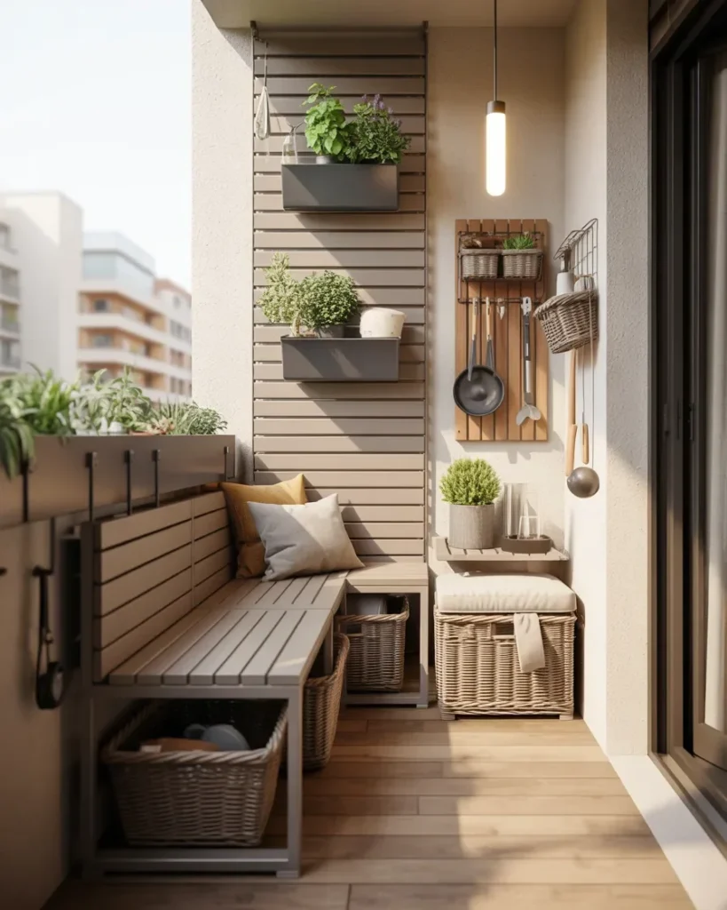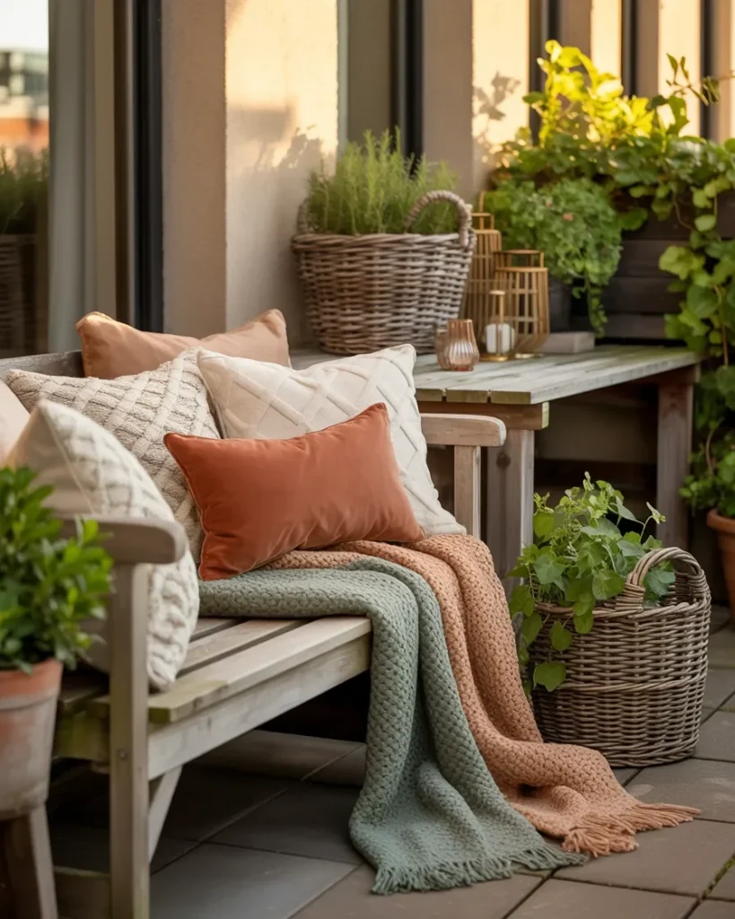This balcony corner creates a cozy and inviting atmosphere with a simple yet effective design. A wooden bench adorned with soft cushions and a knitted throw invites relaxation.