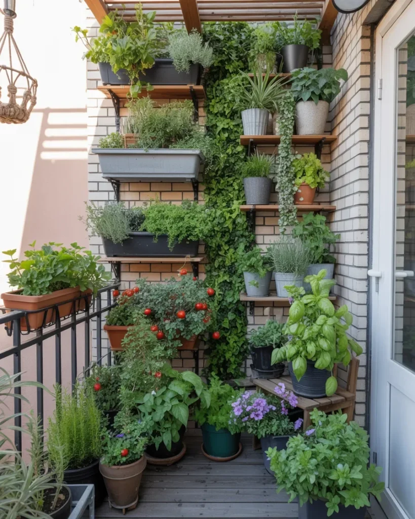 This vertical garden setup brings life to a small balcony with lush greenery. By utilizing wall-mounted shelves and hanging planters, you can save space while creating a vibrant outdoor oasis.