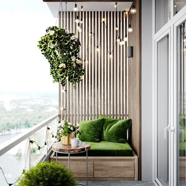 This cozy balcony nook is enhanced by lush greenery and soft lighting. The green cushions on the built-in bench invite relaxation, making it a perfect spot to unwind.
