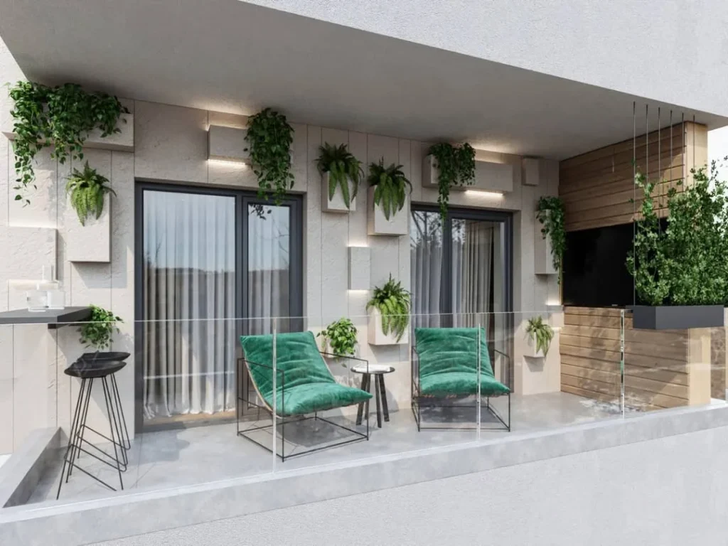 This modern balcony blends greenery with clean lines, creating a stylish and calming retreat. The clear glass railing keeps the space open, while the minimalistic design allows the lush plants to shine.